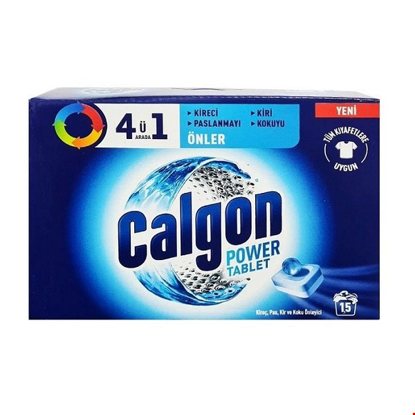 بسته قرص جرم گیر کالگون دارای 15 عدد قرص است که برای ماشین لباسشویی های اتوماتیک مورد استفاده قرار میگیرد
