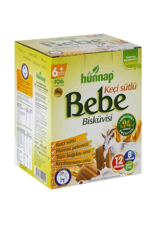 - بسکوییت Hunnap bebe از شیر بز تهیه شده که ضد رفلاکس و ضد آلرژی می باشد .یک بیسکوییت سالم و مقوی برای کودک دلبند شما می باشد .این بیسکوییت به دلیل دارا بودن 12 نوع ویتامین شامل تمام ویتامین های گروه B و D3 آهن و زینک,یک میان وعده کامل برای کودکان 6 ماه به بالا می باشد.بهترین گروه سنی برای استفاده از این محصول 6 ماه تا 36 ماهگی کودکان می باشد.